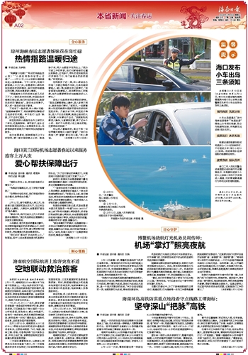 ② 2月13日,志愿者在海口港路口为过海车辆提供服务。