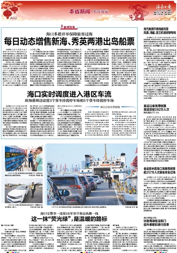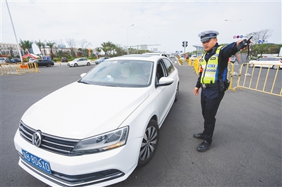 2月15日,在海口新海港客运枢纽站外,交警指引过海车辆进入港口。本报记者 袁琛 摄