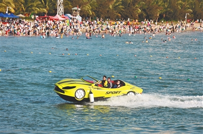 春节期间,游客在三亚湾海月广场附近海域体验水上汽车项目。 袁永东 摄
