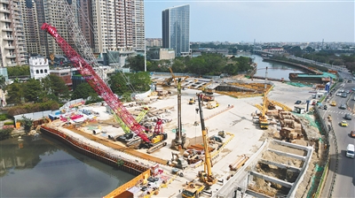 ③ 2月18日,俯瞰位于海口市白龙路下穿通道工程项目,工程车在来回穿梭、各个大型机器正在施工,一派繁忙景象。