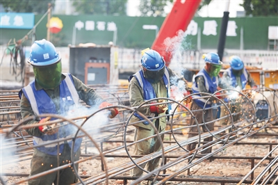 ④ 2月18日,江东新区中建一局承建的中国石油海南区域总部基地项目现场,工人抓紧施工。 本报记者 周达延 摄