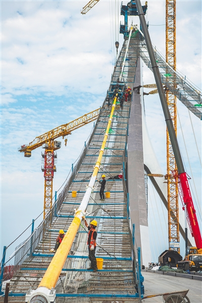 ① 2月18日,建设工人在琼海市乐城大桥上抓紧施工。