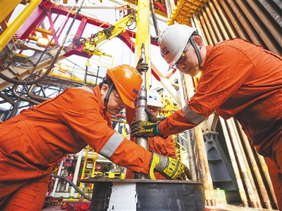 ② 2月18日,中国海油在海南岛南部深水海域开展钻井作业,图为海上钻井平台现场作业团队合力下放钻井工具。