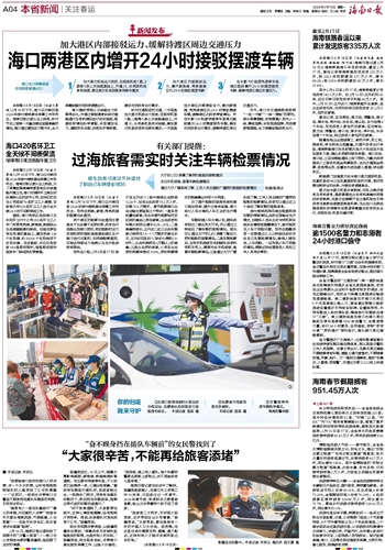 全省交警启动“三道防线”:第一道防线是各市县精准引导提示全省瓜果蔬菜基地、客货运企业等源头企业和外省游客较多的酒店、住宅区错峰出行,同时全力保障瓜果蔬菜运输绿色通道畅通。第二道防线是在环海口市周边5个市县高速公路入口、国省道主要路口路段连续设置提示引导标识标牌,设置疏导岗,引导车辆进入临时停车场,精准放行车辆前往海口“三港”。第三道防线是在海口市港口周边路段及停车场部署1500余名警力、志愿者等力量,实行24小时勤务,设岗查验,按照“客货分离”“预约通行”原则放行,强化港口周边道路管控。
