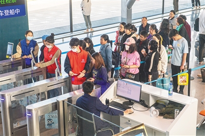 ①在海口新海滚装码头客运综合枢纽站,志愿者协助旅客进行登船身份验证。本报记者 袁琛 摄
