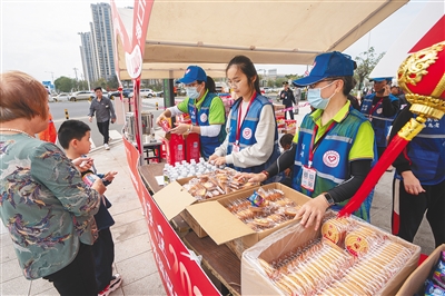 ②志愿者为滞留旅客发放食物。本报记者 袁琛 摄