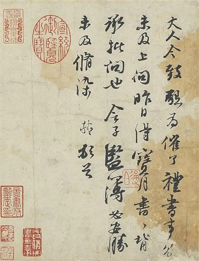 苏轼与米芾绝对算是知己。苏轼被贬黄州时,米芾前往拜访,两人推心置腹,畅谈书艺。自此,米芾 “始专学晋人,其书大进”。米芾的书法夸张变形了二王书法平正温和的结体,造势求异,成就了米芾“沉着痛快,风樯阵马”的书风,走上了一条通向书法大家的道路。两人在绘画意境上,亦意趣相同,苏轼讲求 “简古”“淡泊”;米芾则推崇“平淡”“高古”。生活中,两人也经常交流。据传,米芾曾询问苏轼:“大家都说我颠,你觉得呢?”苏轼给出了一个令人玩味的回答:“吾从众。”这个简单而又有深意的回答,在某种程度上揭示了米芾在历史中的地位和评价,也彰显了苏轼认可米芾与众不同的地位和独特的才华。