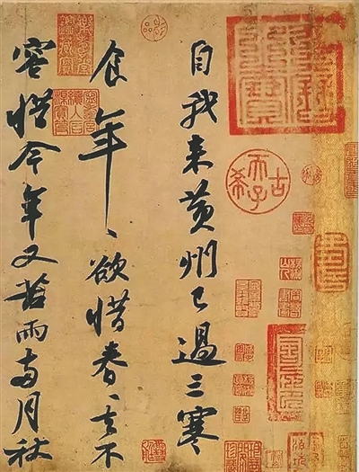 中年时期的东坡,一纸《黄州寒食诗帖》,成为最精彩的人生之笔。此帖书法上笔法浓厚,起伏跌宕,光彩照人,气势奔放,而无荒率之笔。用笔、墨色也随着诗句语境的变化而变化,气势不凡又一气呵成,达到“心手相畅”的几近完美境界。此帖最能体现苏轼的“尚意”精神,使书法与内容、情感、意境完美融合,是书法史上当之无愧的经典。元代鲜于枢把它称为继王羲之《兰亭序》、颜真卿《祭侄稿》之后的“天下第三行书”。《黄州寒食诗帖》是苏轼书法作品的上乘之作,在书法史上影响很大。正如黄庭坚在此诗后所跋:“此书兼颜鲁公、杨少师、李西台笔意,试使东坡复为之,未必及此。”