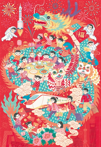 除了传统的年画内容外,本次展品也有许多年轻化的呈现。例如在展品《有求必应》中,戴着川式脸谱的旗手正骑着摩托车送外卖,左右两侧画满了各类用品,上下各书“有求必应”和“五星好评”。《腾飞中国龙》中,高铁、火箭、宇航员都围在巨龙周围。