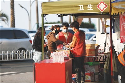 志愿者为旅客发放食物。 本报记者 周达延 摄