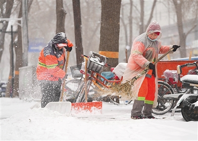 图为环卫工人在河北省石家庄市中山路清扫积雪。新华社发(梁子栋摄)