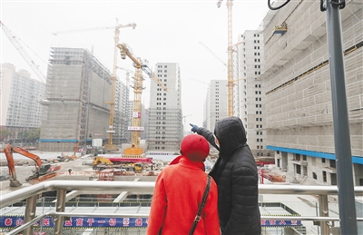 两位市民在上海彭浦新村地铁站出站天桥上观看一旧房改造工程建设工地。新华社发