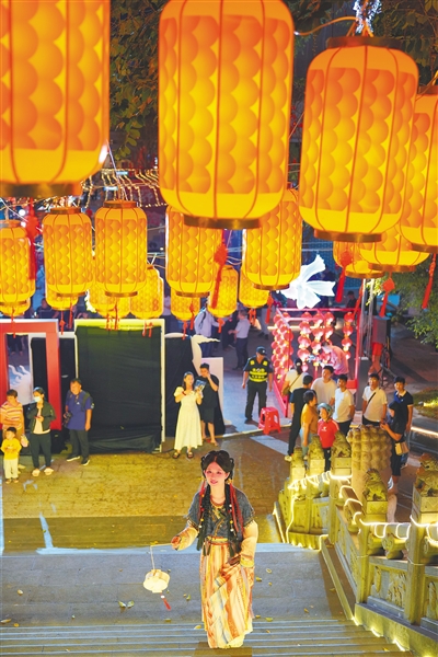 左图:2月22日,元宵佳节临近,海口市府城琼台福地妆点一新,吸引众多市民游客身着传统服饰前来拍照留念。本报记者 张茂 摄