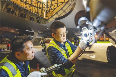 春运期间,在海口美兰国际机场南方航空停机坪,工程师运用专业知识和技能为飞机做“体检”。 本报记者 李天平 摄