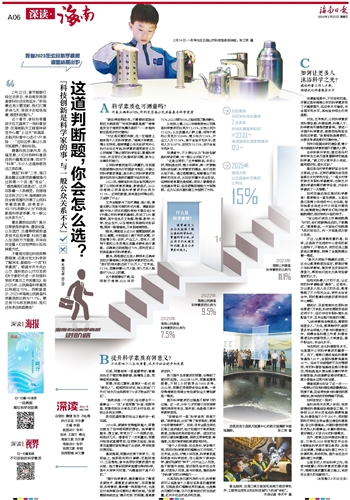 不管是对身边科技的熟悉程度,还是对宏大科学的了解深浅,都指向一个词“科学素质”。根据中共中央办公厅、国务院办公厅印发的《关于新时代进一步加强科学技术普及工作的意见》,到2025年,公民具备科学素质比例超过15%。而数据显示,2023年海南公民具备科学素质的比例为11.1%。要达到15%的发展目标,我们还有多远的路要走?