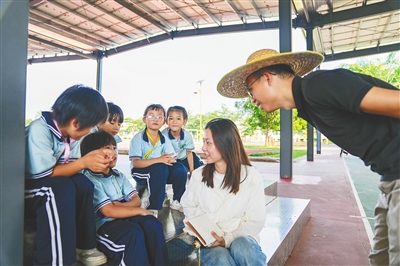 海南日报记者刘宁玥在琼中湾岭学校采访学生。 本报记者 李天平 摄