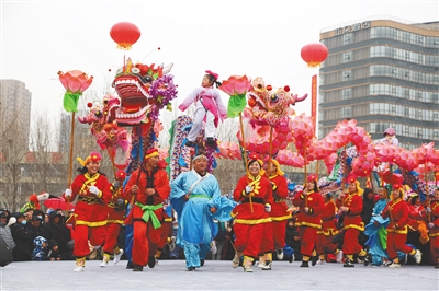 在山东东端,同样拥有悠久历史的“大活报”表演也在欢闹中举行。元宵节当天,在威海市文登区文登学广场,锣鼓声不断,舞龙舞狮、花轿秧歌、安塞腰鼓依次演出,现场观众摩肩接踵。