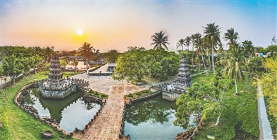 ■ 王亦平距澄迈县城金江以北20余公里的地方,有一个旧称“买榔村”、现名美朗村的火山岩(玄武岩)古村落,屹立着两座古塔——“美榔双塔”。