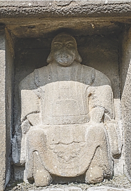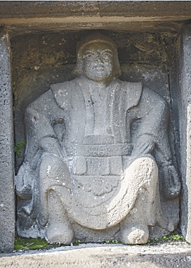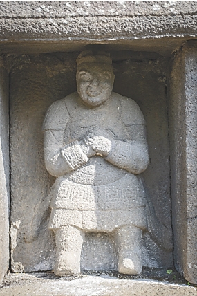 以上所有造像均与背板相连为一体,文、武形象的服饰均为公服,分宽、窄袖两种。从这些造像可以得出以下判断:正面龛内的文官头戴长翅幞头,应为宋中期之后的形象;武官立像身姿略恭,行叉手礼,此礼为宋代礼仪。文武官形象均着长靴,不着履。总体来看,这些服饰带有典型的宋代风格。