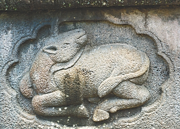 妹塔束腰有中柱。从正面的束腰顺时针方向来看,北侧一组:1.卧姿独角兽(谛听),2.卧姿青狮;东侧一组:1.立姿青狮,2.立姿六齿象;南侧一组:1.立姿青狮,2.卧姿独角兽(谛听)。