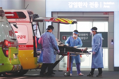 在韩国首尔,医务人员运送新冠患者至急救医疗中心。 新华社/纽西斯通讯社(资料图)