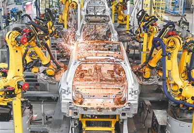 在理想汽车江苏常州基地车间,机械手臂进行焊接作业。新华社发