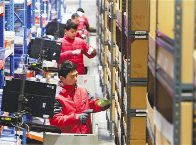 在京东物流郑州亚一物流园区,工作人员在拣选货物。新华社发