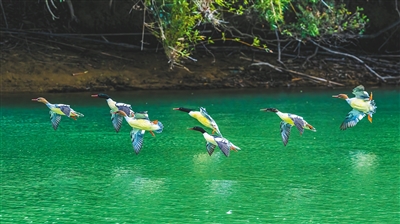中华秋沙鸭在福建省永泰县境内的大樟溪上飞翔。新华社发
