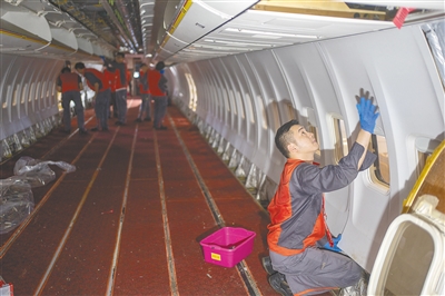 2月29日,在海南自贸港一站式飞机维修产业基地定检机库内,工作人员进行海南自贸港首单波音737NG飞机“客改货”业务。 本报记者 袁琛 通讯员 张健 摄