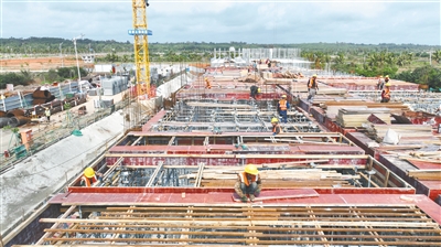 2月29日,在文昌市冯家湾现代化渔业产业园科研中心项目建设现场,工人们进行钢筋绑扎等作业。通讯员 姚腾岱 宋紫欣 摄