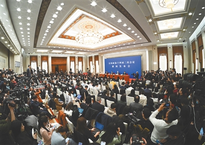 人民大会堂一层新闻发布厅,座无虚席。中外记者用摄像机、相机等设备,实时向世界报道发布会的最新情况。