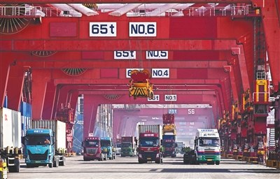 卡车在青岛港集装箱码头装运集装箱。 新华社发