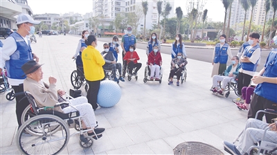 海南大学青年志愿者协会敬老团队队员在陪伴老人做游戏。