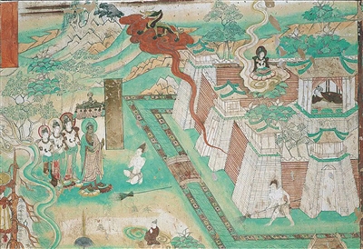 榆林窟(位于甘肃酒泉)第25窟描绘古人想象中的龙王布雨场景。