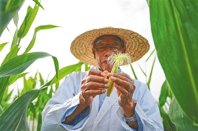 河南省鹤壁市农业科学院玉米育种专家程相文,在海南三亚一处南繁基地内查看授粉期玉米材料的生长情况。本报记者 王程龙 摄