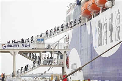 三月五日,旅客在山东港口烟台港乘船前往大连。新华社发