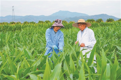 河南省鹤壁市农业科学院玉米育种专家程相文(右)带领学生,在三亚一处南繁基地查看授粉期玉米材料的生长情况。本报记者 王程龙 摄