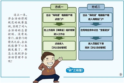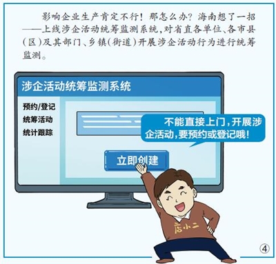 注解日前,海南省涉企活动统筹监测系统正式上线,该系统是省营商环境建设厅基于“海政通”平台开发的一款规范涉企活动行为的应用,对省直各单位、各市县(区)及其部门、乡镇(街道)开展涉企活动行为进行统筹监测,做到“无事不扰”,为企业发展创造良好的营商环境。