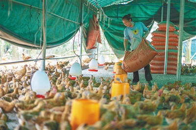 3月6日,在文昌东路农场公司九队文昌鸡橡胶林下养殖基地,职工为鸡添加饲料。本版图片除署名外均由本报记者 袁琛 摄