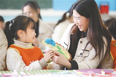 3月7日,在山东省临沂市郯城县郯城街道东南村英杰幼儿园,一名小女孩将制作完成的画献给妈妈。新华社发(张春雷 摄)