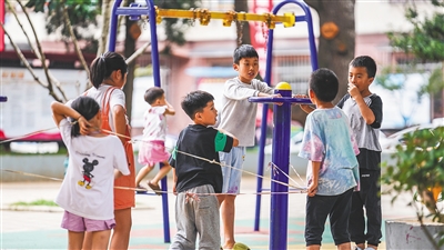 小朋友在六盘水市钟山区黄土坡街道文明巷小区中心广场玩耍。