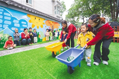 浙江省杭州市西湖区北山街道松木场社区,老师带着小朋友们在社区新建成的托育中心玩游戏。