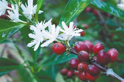 ①万宁兴隆的咖啡树上,盛放的咖啡花和红色咖啡果。通讯员 杨师忠 摄