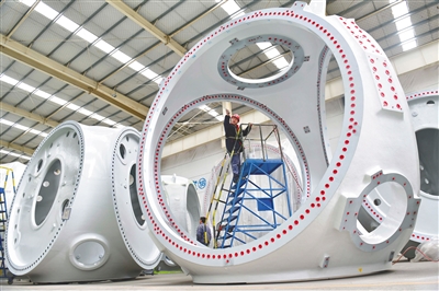 在山东省滨州市惠民经济开发区风电装备制造产业园涂装车间,工人在涂装风电轮毂。 本版图片均由新华社发