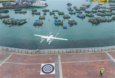 图为在深圳大鹏新区南澳街道,丰翼无人机搭载着海鲜起飞,前往龙岗区的起降点。