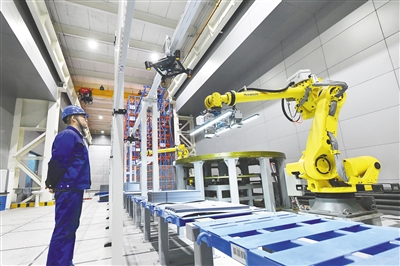 在哈电集团哈尔滨电机厂有限责任公司汽轮发电智能叠片间,工作人员在观察智能设备运行情况。