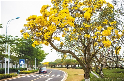 海口市碧海大道边上,一排排黄花风铃木竞相绽放。 海南日报记者 宋国强 摄