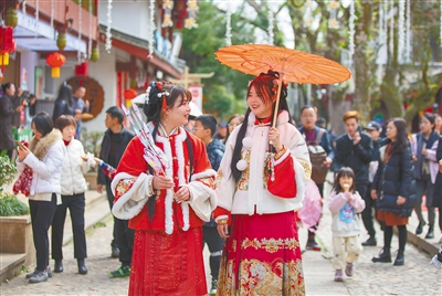 两名穿着传统服饰的游客在集市游玩。 新华社发