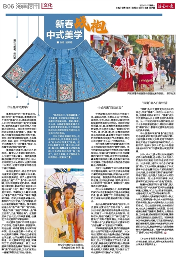 如果说中式美学是对审美的一种文化表述,国潮则是一种文化与经济相结合的具体实践,是让中式美学走入大众生活的尝试。它让古老变年轻,让传统变时尚,也让大众消费更有文化底蕴。如今在海南也掀起了国潮风、黎潮风,从特色岛服、工作场景、时尚秀场到日常穿搭,黎族元素在服饰设计上随处可见。民族审美作为中式美学大范畴,它不是民族传统元素的简单挪用,而是对中式美学和东方审美的文化认同,是优秀传统文化的创造性转化与创新性发展。相信中式美学造就了“国潮”,也必将引领国际潮。