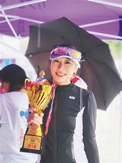 刘欣欣领取2023海口湾路跑段位赛女子组10公里冠军奖杯。 本版图片均由受访者提供